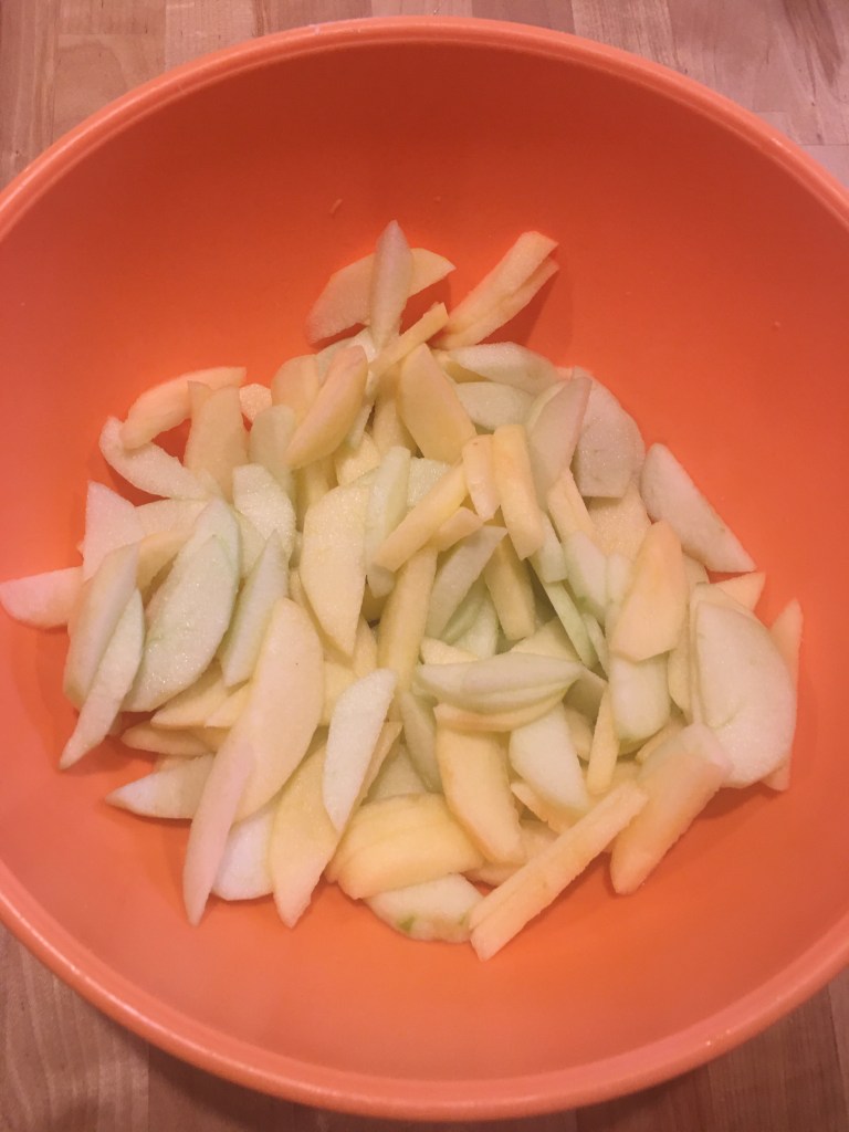 First peel, core and cut up all your apples into thin slices. (I would use a sharp knife for this step.) Then add the lemon juice to the apples so they don’t brown.