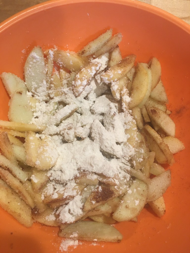 Add the sugar, flour and spices to the apples and mix it all up.