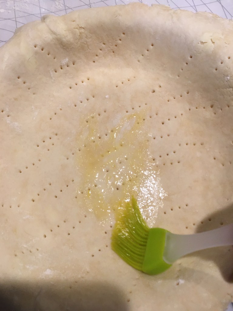 Take your pre-made pie crust and roll it out until its about 2 inches bigger than your pie pan you are using on a floured surface. Here is my favorite pie crust recipe, https://the-road-less-traveled.com/2020/11/16/my-all-butter-pie-crust-recipe/. Before you add the pie crust into the pie pan lightly grease with cooking spray. It prevents the pie crust from sticking, so that when serving it comes out easily. Next add the pie crust to the pie pan, I use a fork and poke little holes in the bottom to prevent bubbling up. Then I mix the egg, a Tablespoon of water and a pinch of salt together to make an egg wash. I then brush the egg wash on the bottom layer of the crust, it helps it become crunchy instead of mushy and helps prevent it from becoming undercooked.