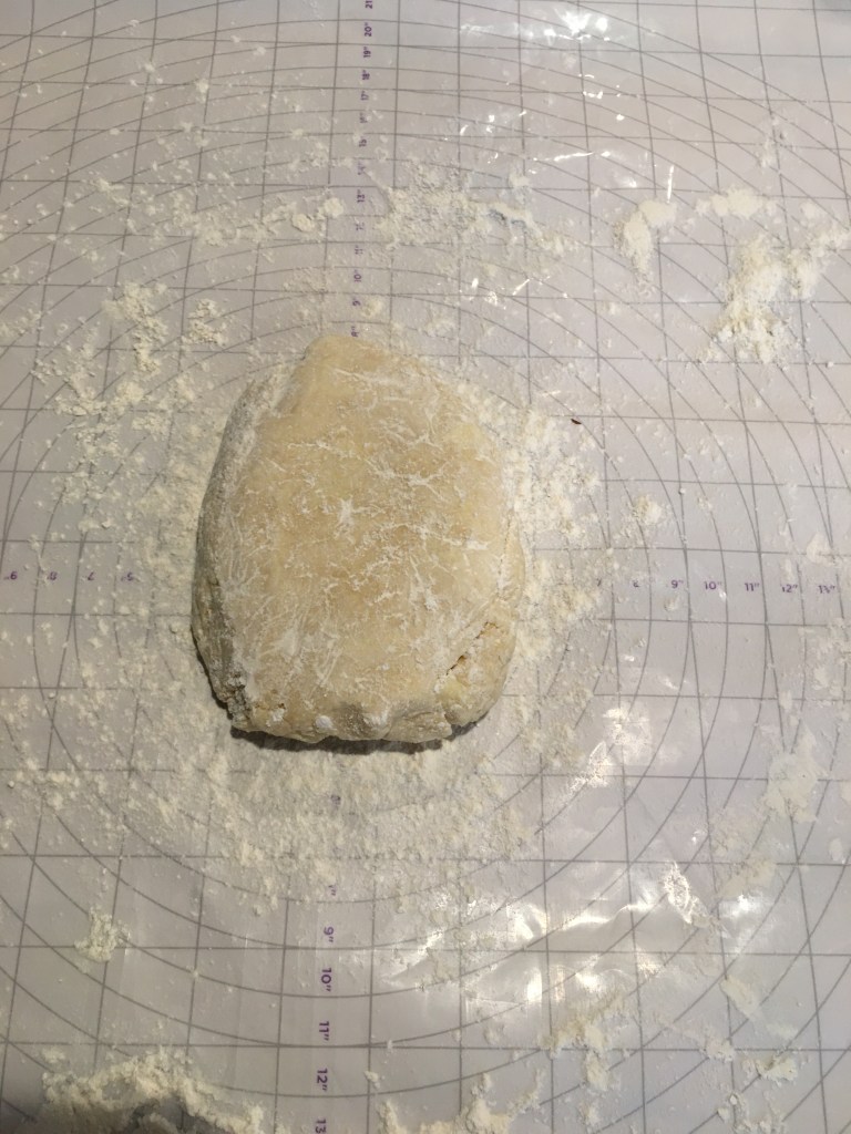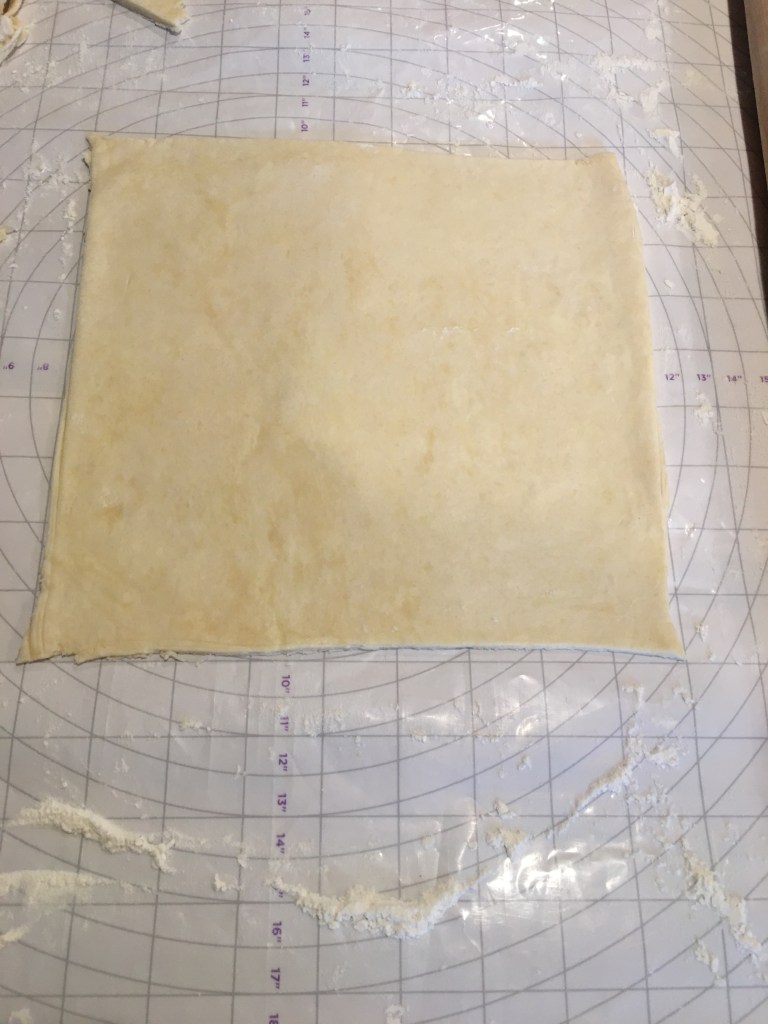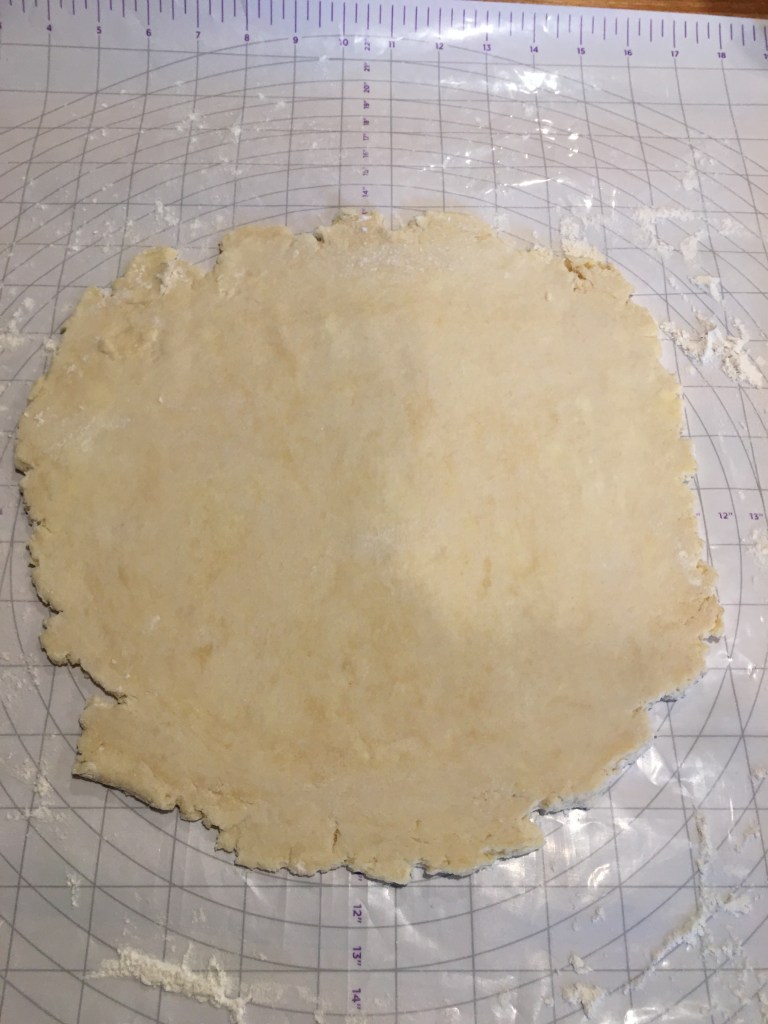 Now for the lattice work. This technique may seem daunting and difficult but once you understand the process it is very simple and easy. First roll out the second half of the dough on a floured surface, until it is the length and width of the pie. Then use a knife and cut it into a square, you may need to roll it out a little more to get it to the size you need.