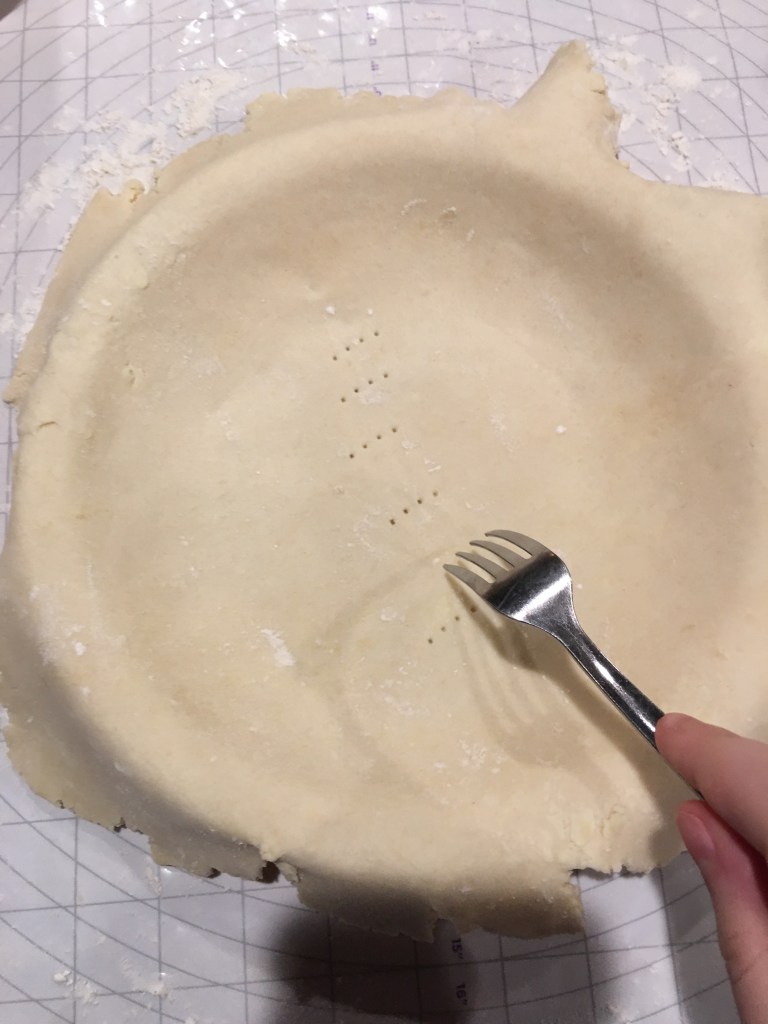 Next roll out my pre-made pie crust on a floured surface, about 2 inches larger than the pie pan your using. Then spray my pie pan with cooking spray so it comes out easy when it’s time to cut it. Then poke some holes in the bottom crust with a fork and brush the bottom crust with some egg wash. This helps the bottom crust to become crisp.