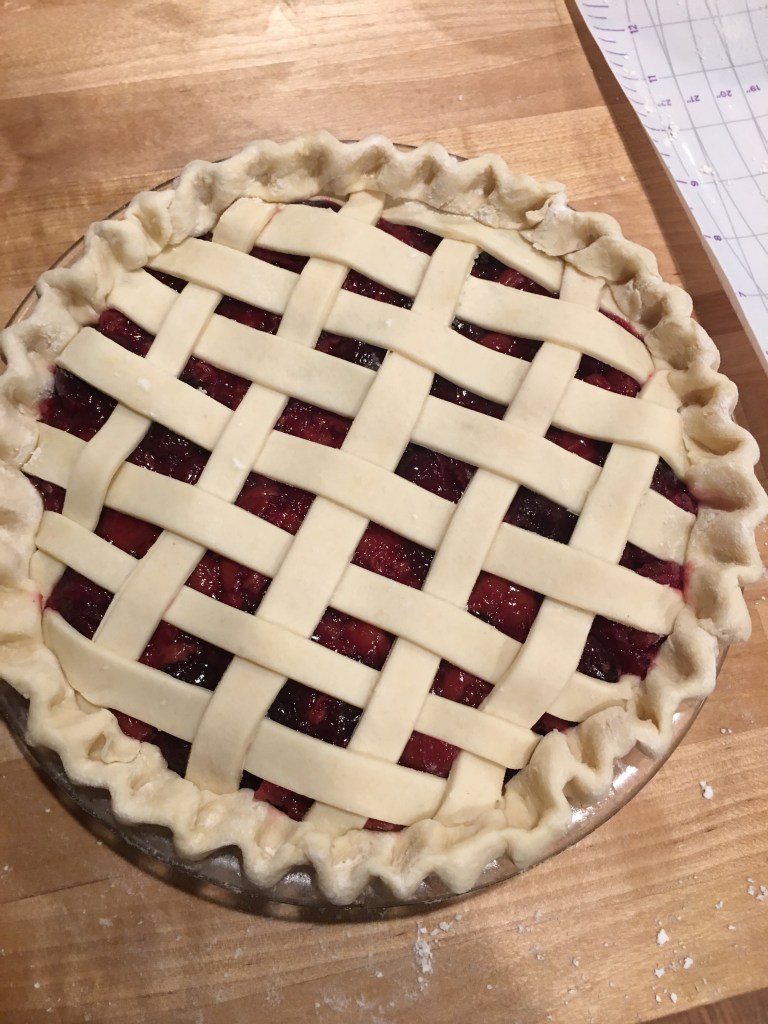 Next add the cherry pie filling into the pie shell making sure it’s level. I then do lattice work on top of the pie instead of a full sheet of pie crust. Here is a link to my tutorial for lattice work https://the-road-less-traveled.com/2020/11/18/apple-pie-recipe-and-lattice-work-tutorial/, but you can do whatever you want for the top.
